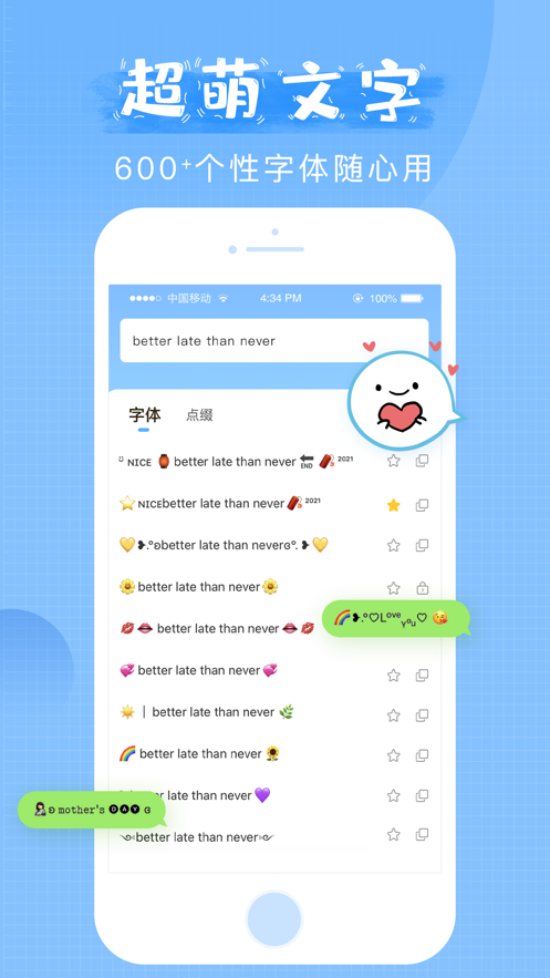 通过使用软件,让用户的手机更加的时尚和个性,可以在平台上面进行字体的设置,所带给用户的字体非常的多样化,还可以在平台上面进行字体的装饰,还包含了大量的特殊符号,能够让用户更好的去进行聊天,所具备的文案也非常的多,满足了不同用户的不同需求。